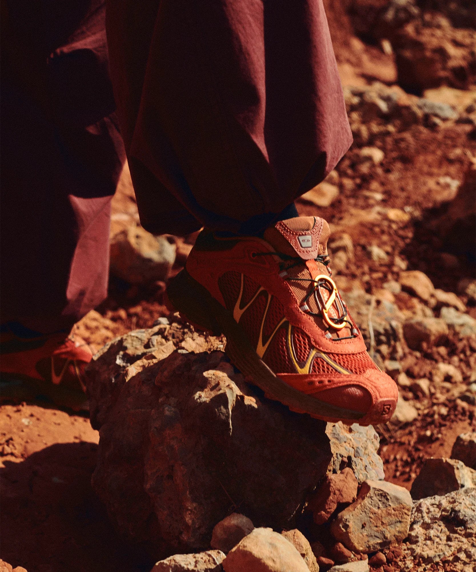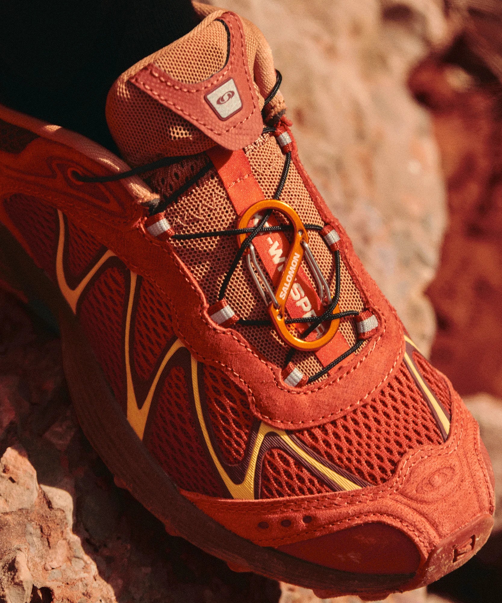 This XT-Whisper Fiery Red Ashes pays homage to the arid, relentless and unique ecosystem of the harshest deserts. A scuffed leather effect mimicking sand-worn surfaces and snakeskin-like details on the toe, heel and tongue create a rugged yet refined look. Textured mesh adds breathability and embodies the resilience of this harsh terrain.
